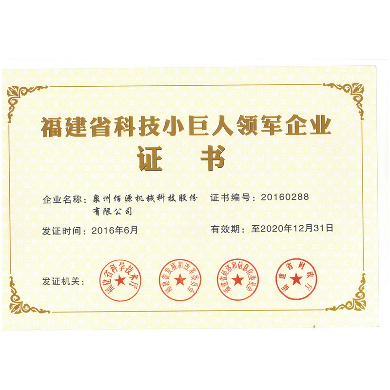 福建省科技小巨人領軍企業(yè)證書